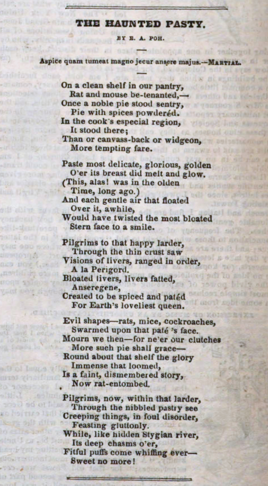 Mathew was writing anonymously for a New York humor magazine, patterned somewhat after Britain's "Punch," called "Yankee Doodle." It was published in 1846 and part of 1847. Mathew wrote two parody poems on Poe, under the derisive pseudonym, "E.A. Poh." The first of these lampoons  "The Haunted Palace," while the second targets "The Raven." The subject of "The Haunted Pasty," which appears in the first or second edition for 1846, is pastries in the kitchen which are attacked by vermin. This was Mathew's view of Poe's poetical sensibilities, and moreover his opinion of what Poe did to Art, itself. But Mathew also loved to introduce his writing with a quote; and in this case, the quote is in Latin. If Mathew used Latin, you can bet it was code. Here, the quote reads: